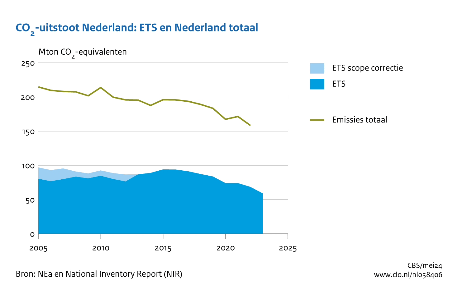 De uitstoot van Nederlandse bedrijven die deelnemen aan het Europese emissiehandelssysteem (EU ETS) is in 2023 met 14,1 procent gedaald (jaar-op-jaar) naar 58,9 Mton CO2-equivalenten. Dit is exclusief de CO2-uitstoot door de luchtvaart; deze is in 2023 met 11 procent gestegen (jaar-op-jaar) naar 2,6 Mton.