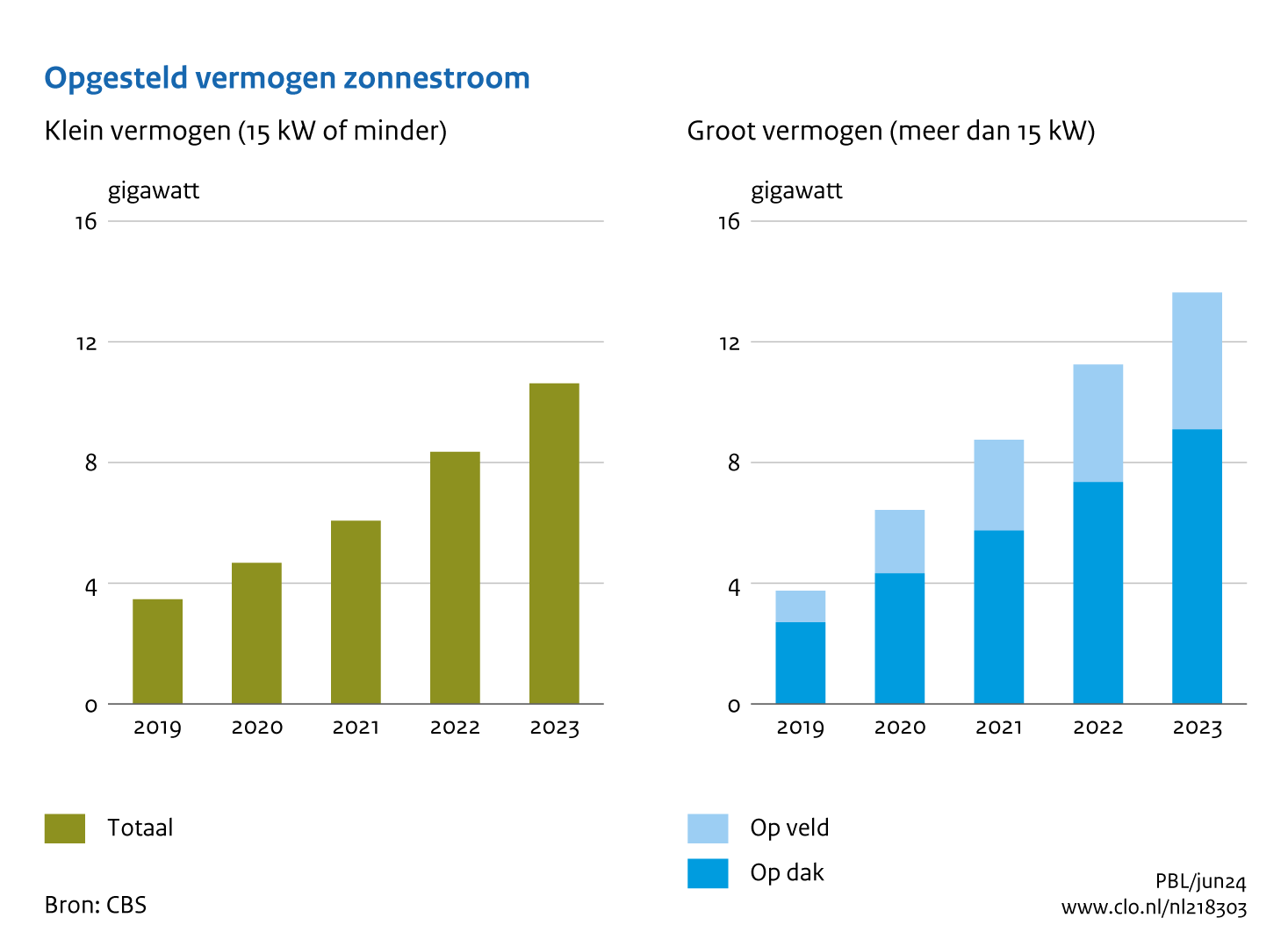 Tussen 2019 en 2023 is het geïnstalleerde vermogen uit grootschalige installaties gegroeid naar 13.634 megawatt, een toename van 363 procent (CBS, 2024). In dezelfde periode groeiden de kleinschalige installaties naar 10.625 megawatt, oftewel met 306 procent. In een periode van sterk toenemende energieprijzen groeide het opgestelde vermogen van kleinschalige installaties tussen 2021 en 2023 met 75 procent en van grootschalige installaties met 52 procent. Hiermee is het aandeel van kleinschalige installaties in het totale opgestelde vermogen gestegen naar 44 procent.